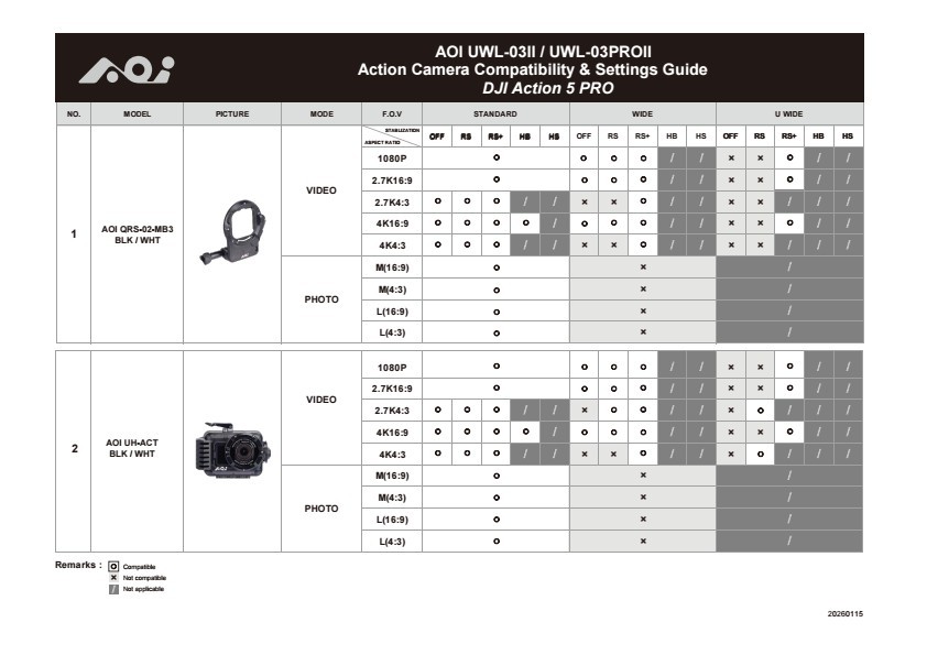 MODEL AOI QRS-02-MB3-BLK AOI QRS-02-MB3-WHT DESCRIPTION Quick Release System 02 Mount Base for DJI OSMO Action 5/ 4 Waterproof Cases COLOURS Black White MATERIAL PC+GF COMPATIBILITY Lenses - UCL-03 / UWL-03 / UWL-03PRO