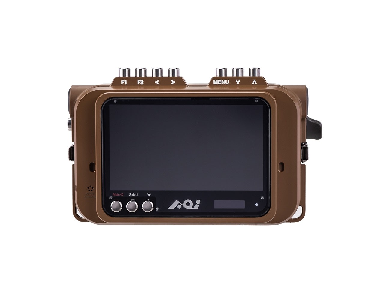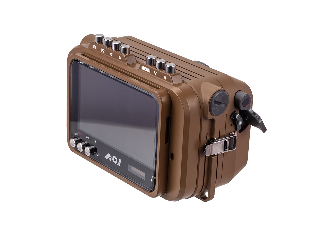 Housing Internal SurfaceMAIN BODY COLOR Cerakote TROY COYOTE TAN (H-268) LENS PORT MOUNT & FILTER SLOT AOI Quick Release System (QRS) - QR2 Mount with Color Filter Slot LENS PORT GLASS Multi-layers AR and Hydrophobic Coating WATER LEAKAGE PROTECTION Built-in Vacuum Analyzation & Water Detection System (VWS) BUILT-IN WATER DEPTH MONITOR Max. Monitoring Depth up to 100 Meters with Preset Depth Alarm Function BUILT-IN DISPLAY MONITOR 5" Full HD (1920x1080 pixels) 16:9 Display Monitor Viewing Angle 80° / 80° (L/R & U/D) High Brightness 400 cd/m2 and Contrast 1000:1 Focus Peaking Assist Digital Zoom (4x, 9x, 16x) Assist RGB Histogram, Waveform, Vector Scope & Monochrome …etc. Functions Two Custom-setting Buttons (F1 & F2) POWER SUPPLY